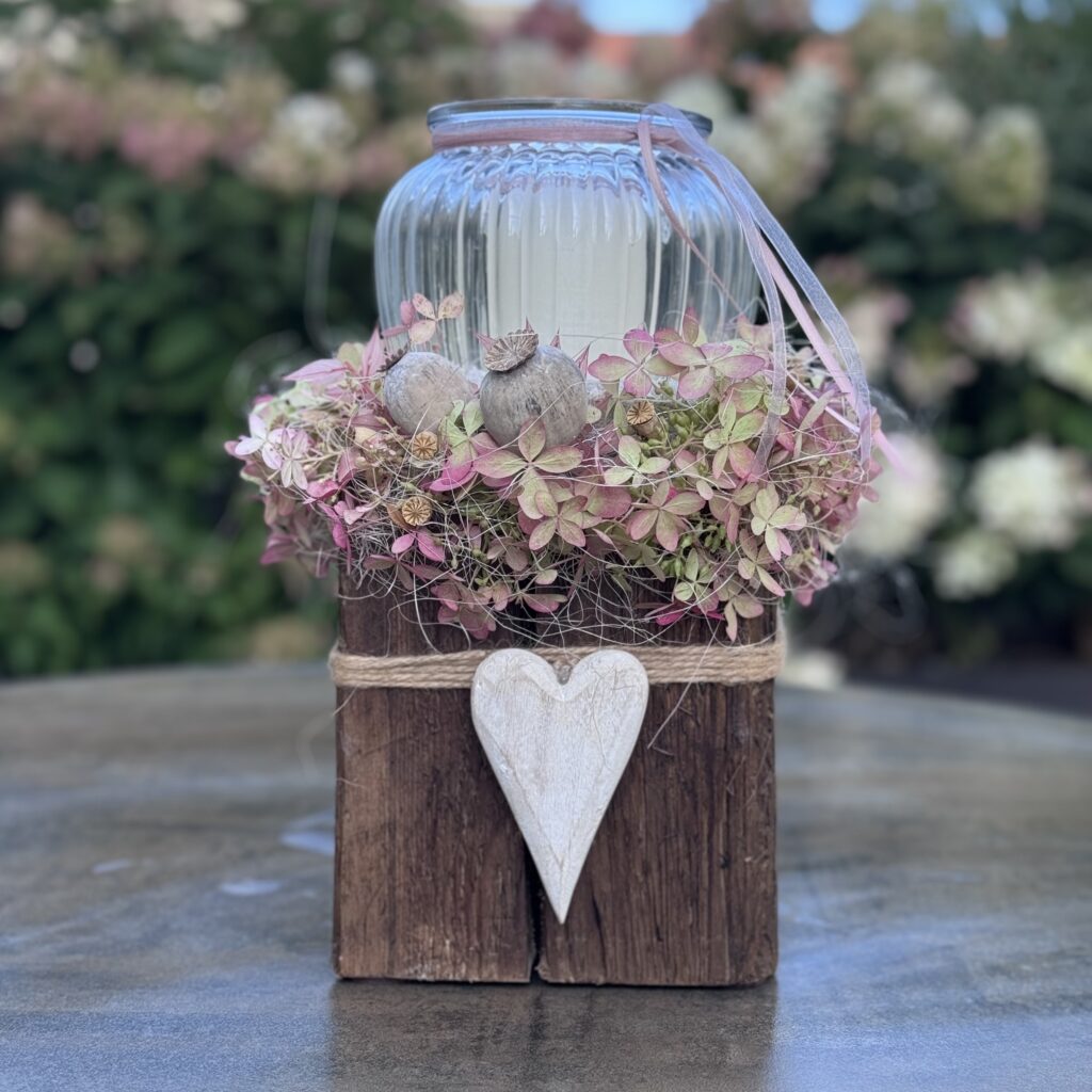 Ein Highlight sind auch meine dekorierten Holzscheiben – verziert mit kleinen Kürbissen, Eicheln, Beeren und Pilzen. Diese rustikalen Hingucker bringen sofort herbstliche Gemütlichkeit in dein Zuhause. Ausserdem findest du bei mir Laternen mit Lichteffekt, herbstlich dekorierte Gläser mit Trockenblumen, kleine Steckvariationen auf Altholz, oder stimmungsvolle Mini-Gestecke für Fensterbänke oder Regale.